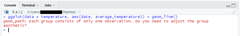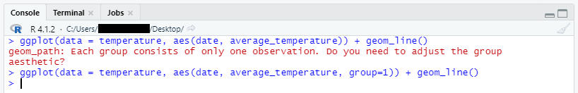 ggplot 함수를 사용하기 전에 group을 설정하지 않으면 다음과 같은 오류가 나타나면서 그래프가 제대로 만들어지지 않습니다.