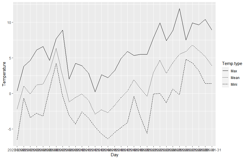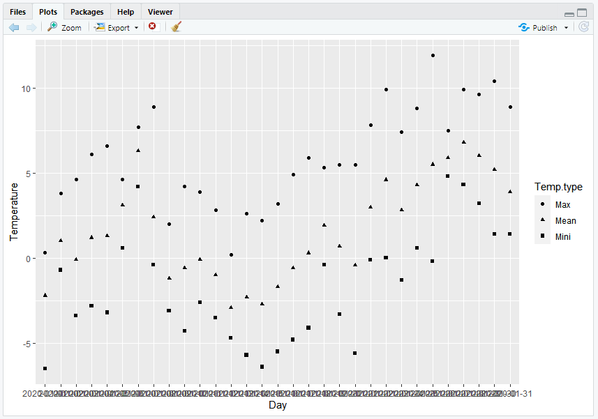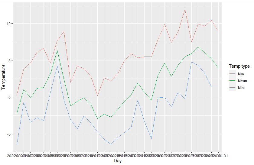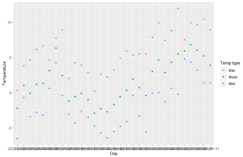 ggplot2를 이용해 산점도 그래프를 중첩해서 그리려면 다음과 같이 Temp.type 열을 만들어 분류하는 식으로 데이터를 정리해주는 것이 좋습니다.
