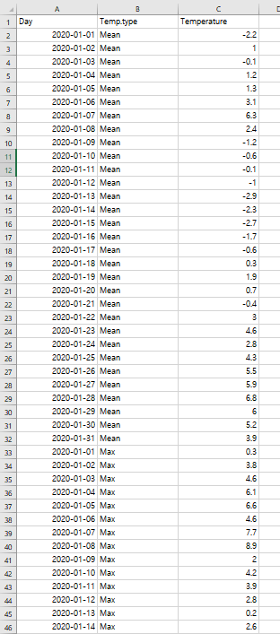앞서 설명한 것처럼 꺽은선 그래프를 그릴 때에도 데이터는 다음과 같이 정리해주는 것이 좋습니다.