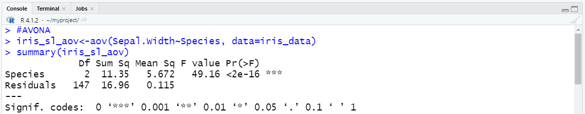 따라서 species에 따라 Sepal.Width에 대해 분산분석을 먼저 수행합니다. 저는 분산분석한 데이터를 iris_sl_aov라고 저장하겠습니다.
