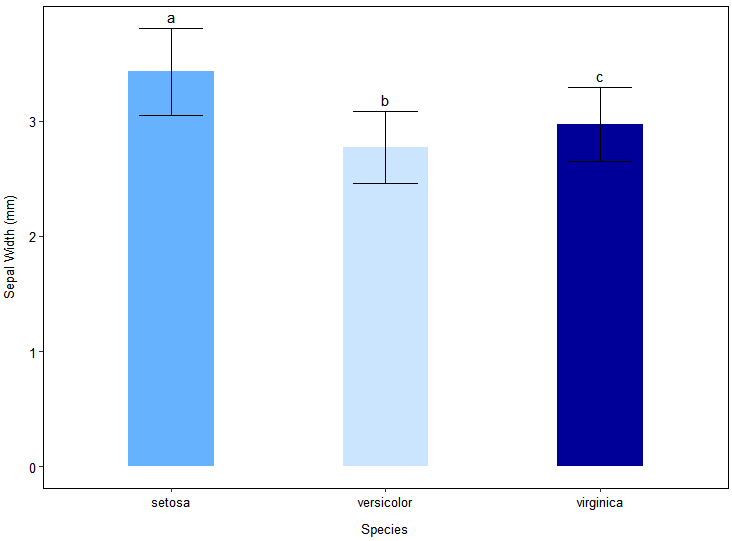 유의수준 0.05에서 sepal width는 setosa 품종이 가장 크고, 그 다음으론 virginica, versicolor 순으로 큰 것을 알 수 있습니다.